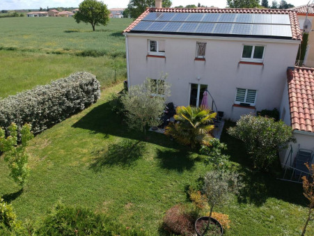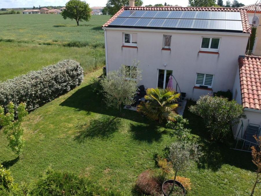Ravissante maison de 5 pièces sur une parcelle de 450 m2, elle se compose d'une entrée avec un placard de rangement aménagé, d'un séjour lumineux, d'une cuisine aménagée et équipée ouverte sur la pièce à vivre, d'un wc, à l'étage, 4 chambres dont une avec une salle d'eau privative, d'une salle de bain, d'un second wc, plancher chauffant, garage avec une mezzanine, beau jardin paysager, panneaux photovoltaïques 3 kWc, fibre, secteur calme